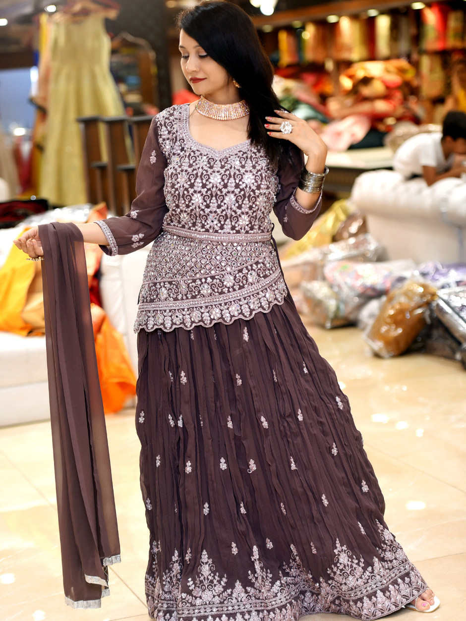 Step into elegance with our Radiant Henna Blossom. Adorned with intricate Zari Embroidery, the henna-colored lehenga flows...
